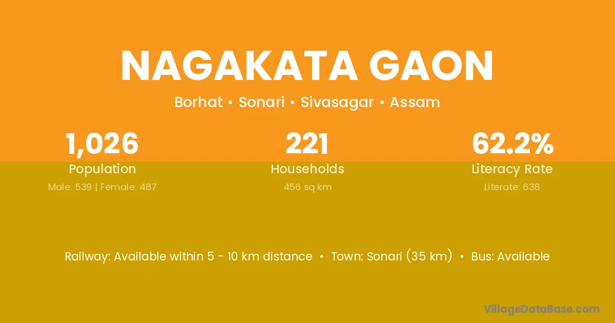 Sonari (35 km) is the nearest town to Nagakata Gaon village for major economic activities and is located approximately 35 km away.
