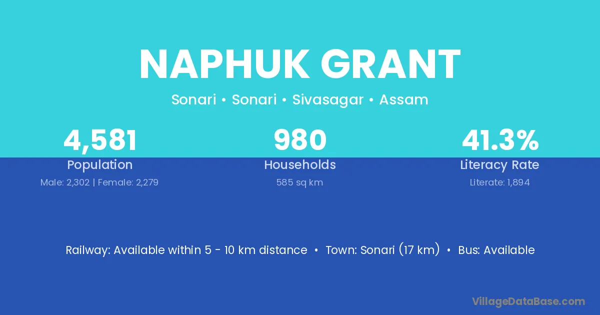 Sonari (17 km) is the nearest town to Naphuk Grant village for major economic activities and is located approximately 17 km away.