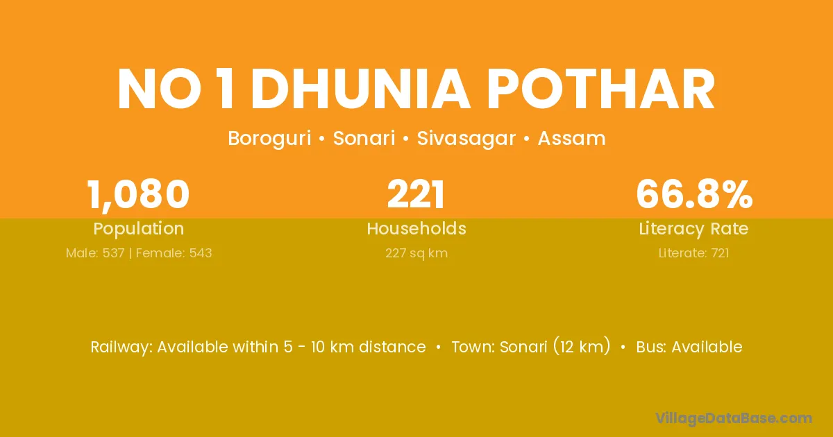 Sonari (12 km) is the nearest town to No 1 Dhunia Pothar village for major economic activities and is located approximately 12 km away.