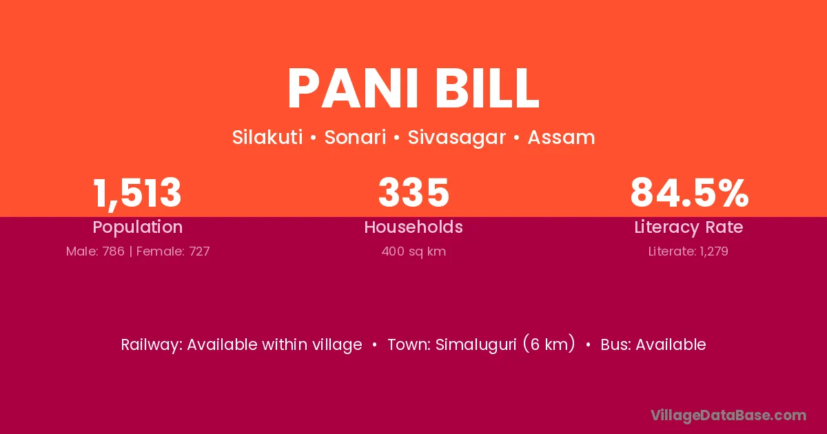 Simaluguri (6 km) is the nearest town to Pani Bill village for major economic activities and is located approximately 6 km away.
