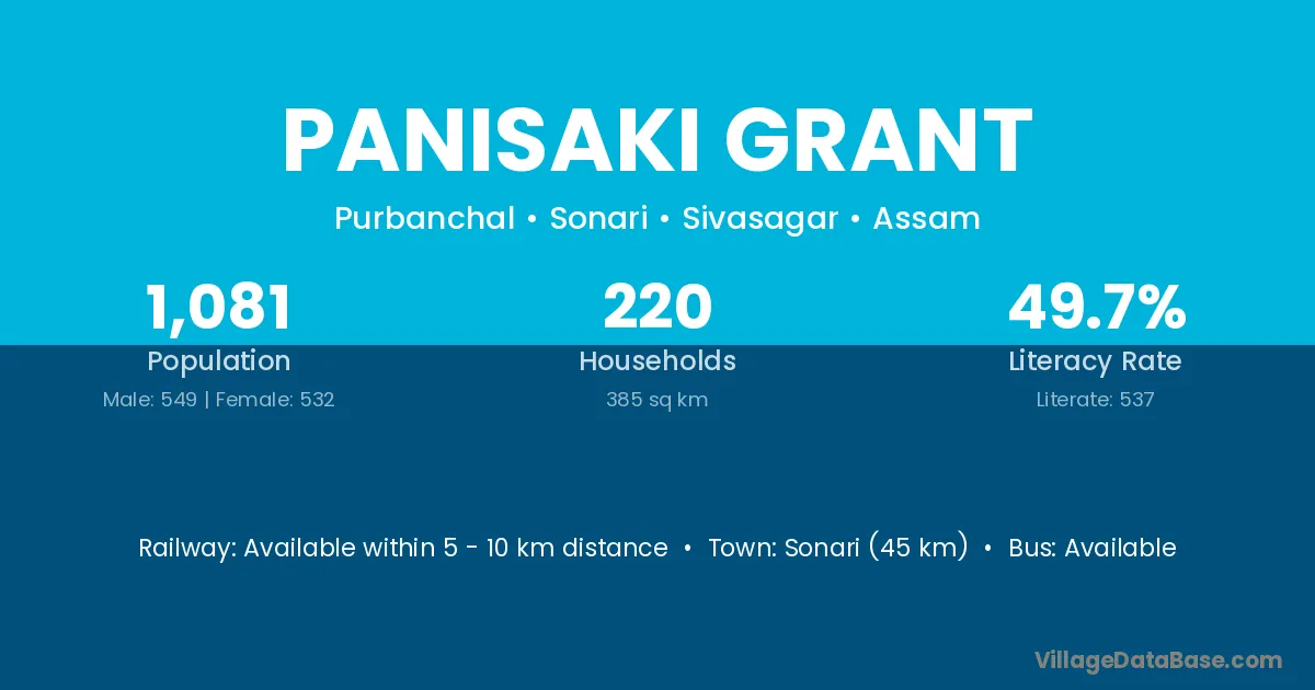 Sonari (45 km) is the nearest town to Panisaki Grant village for major economic activities and is located approximately 45 km away.
