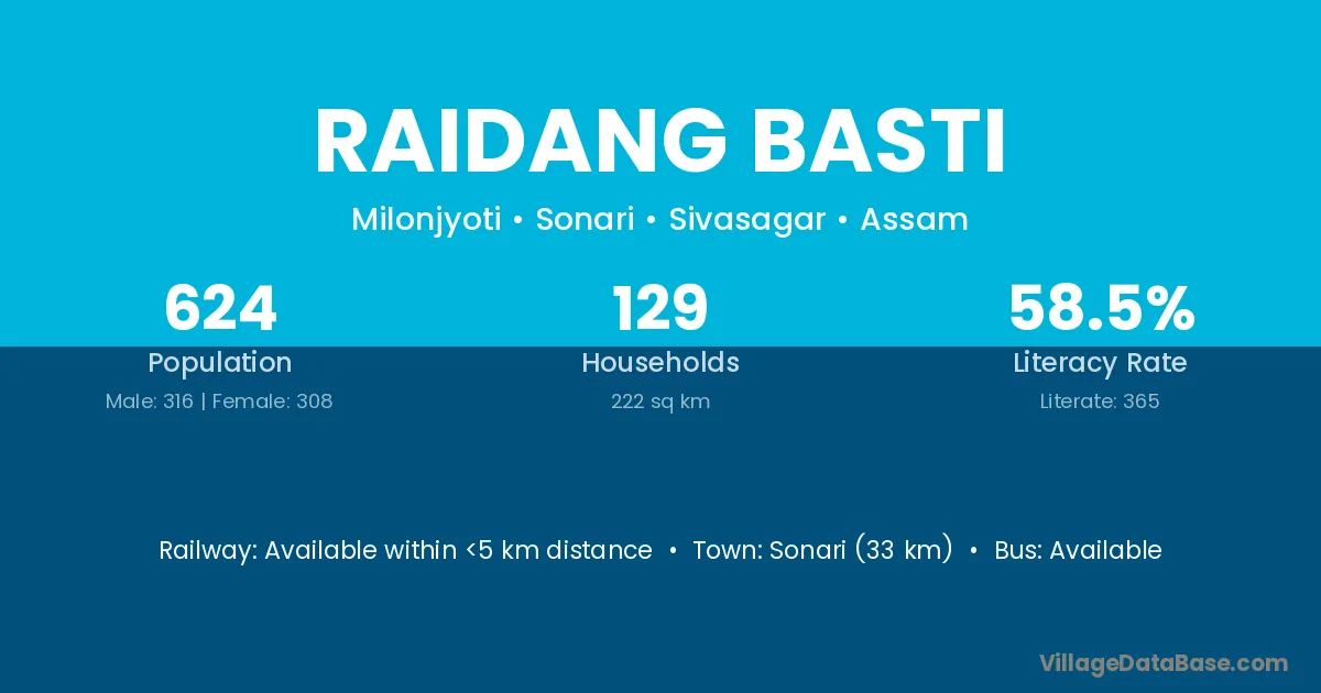Sonari (33 km) is the nearest town to Raidang Basti village for major economic activities and is located approximately 33 km away.