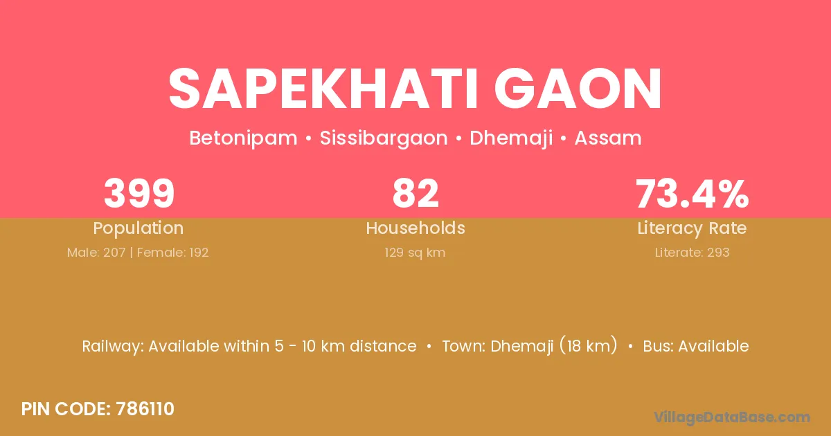 Sonari (18 km) is the nearest town to Sapekhati Gaon village for major economic activities and is located approximately 18 km away.