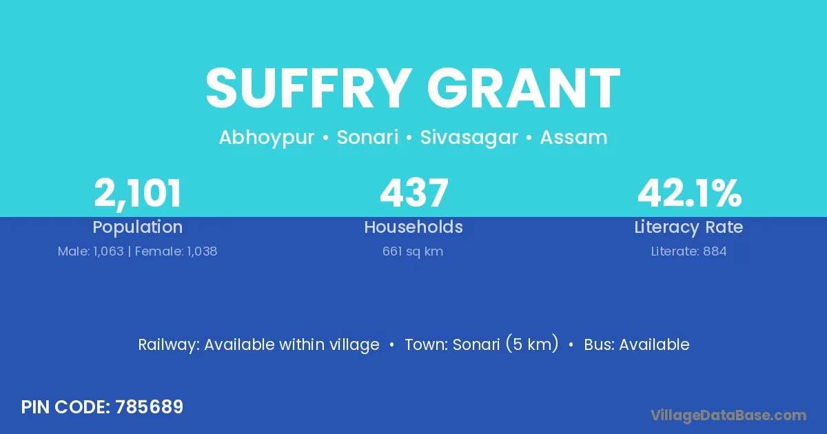 Sonari (5 km) is the nearest town to Suffry Grant village for major economic activities and is located approximately 5 km away.