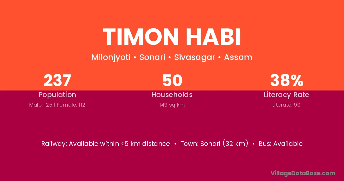 Sonari (32 km) is the nearest town to Timon Habi village for major economic activities and is located approximately 32 km away.