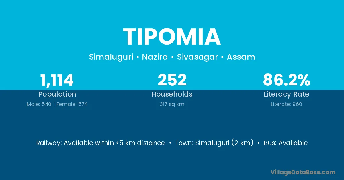 Simaluguri (8 km) is the nearest town to Tipomia village for major economic activities and is located approximately 8 km away.