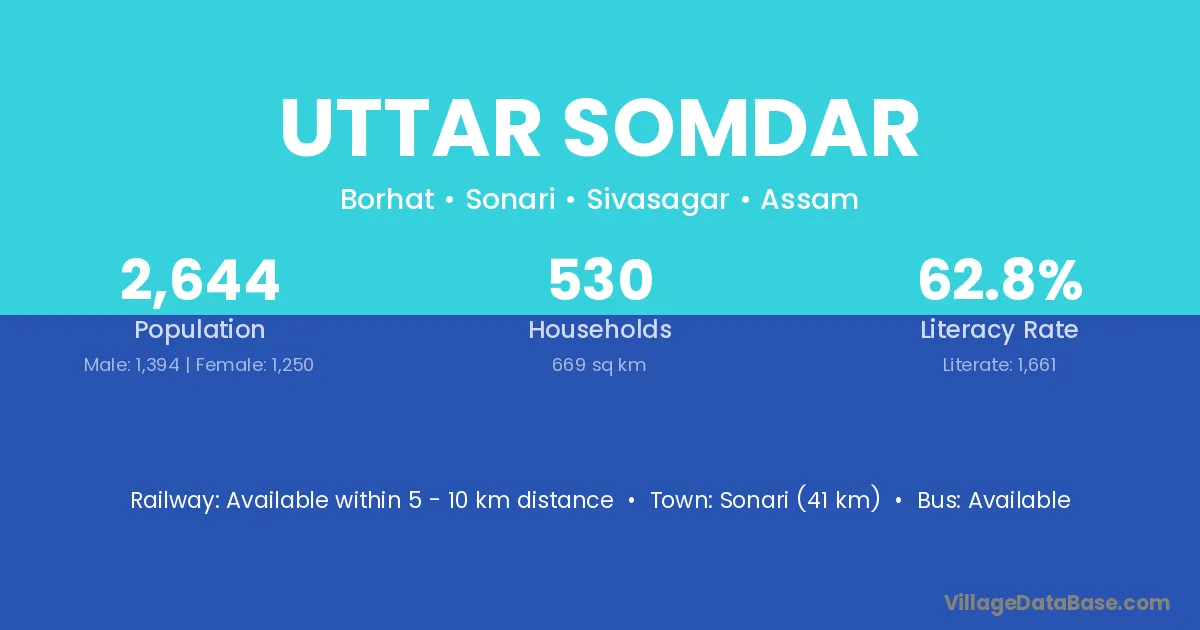Sonari (41 km) is the nearest town to Uttar Somdar village for major economic activities and is located approximately 41 km away.