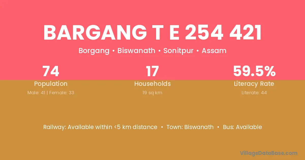 Bargang T E 254 421 village has a total population of 74 people, of which 41 are males and 33 are females.