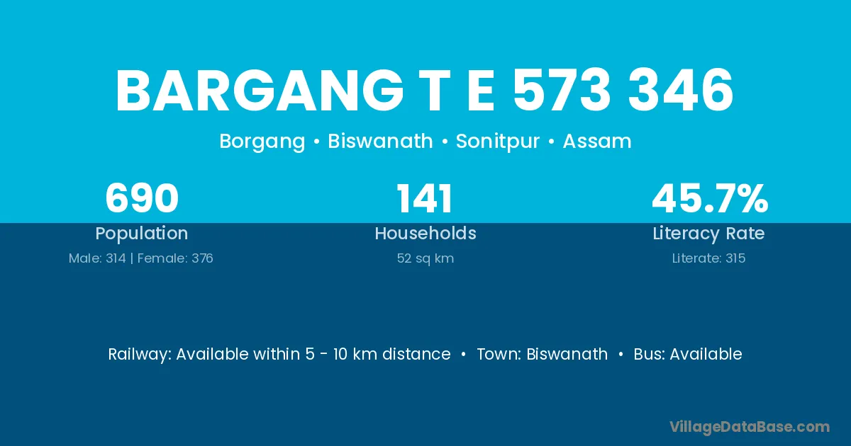 Bargang T E 573 346 village has a total population of 690 people, of which 314 are males and 376 are females.