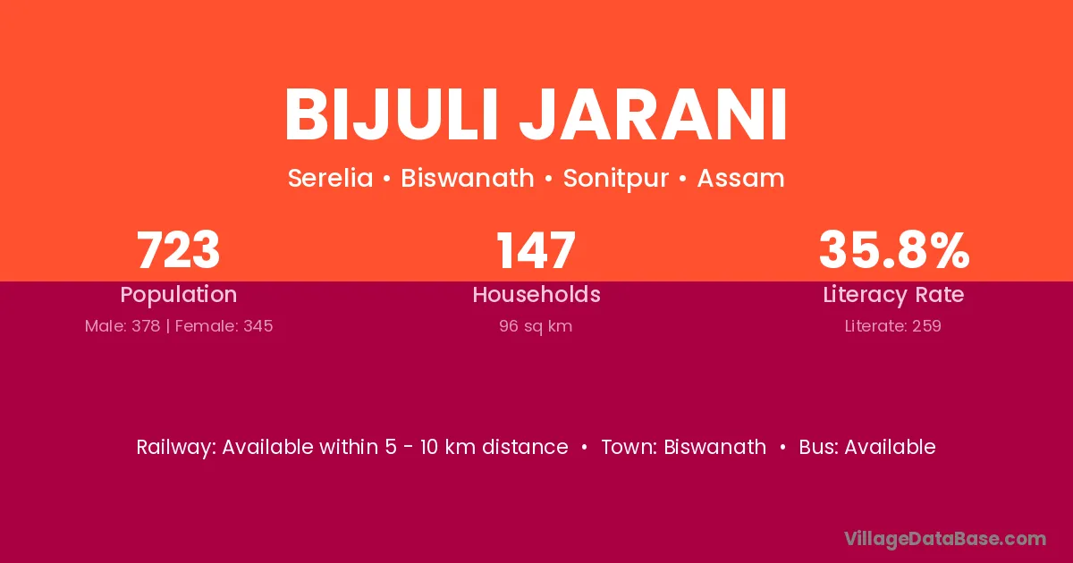 Bijuli Jarani village has a total population of 723 people, of which 378 are males and 345 are females.