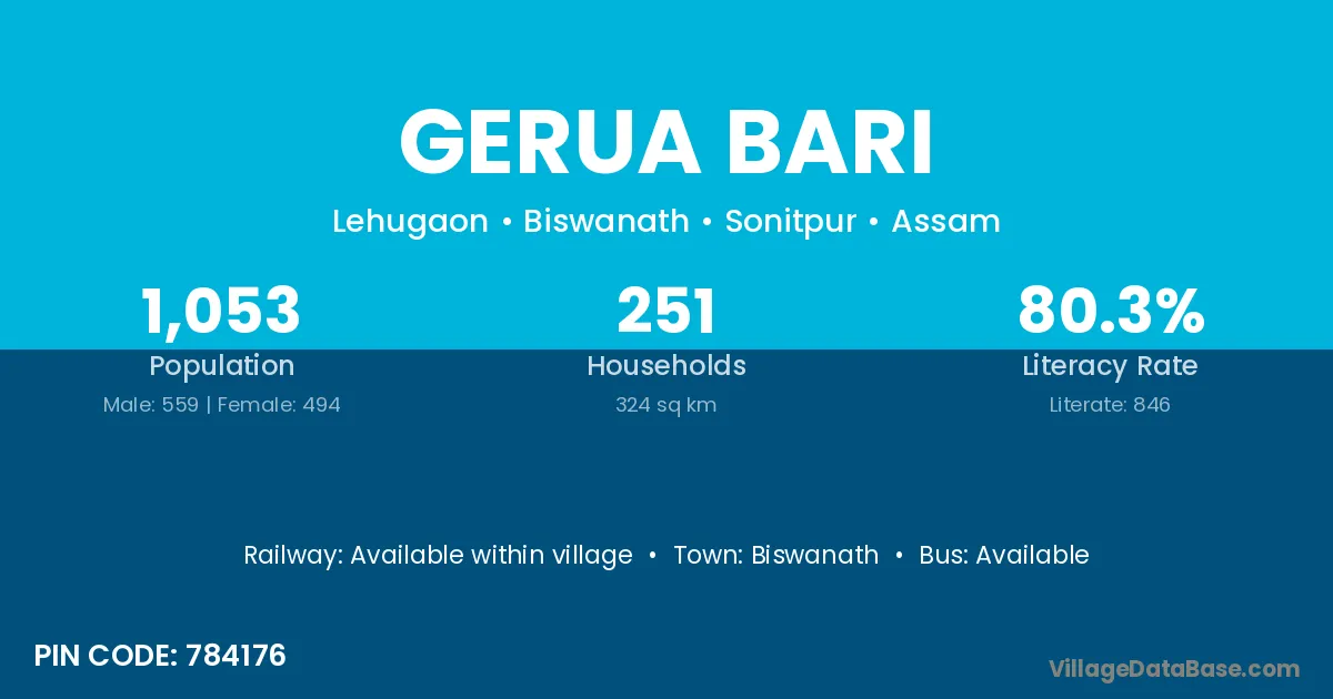 Gerua Bari village has a total population of 1,053 people, of which 559 are males and 494 are females.