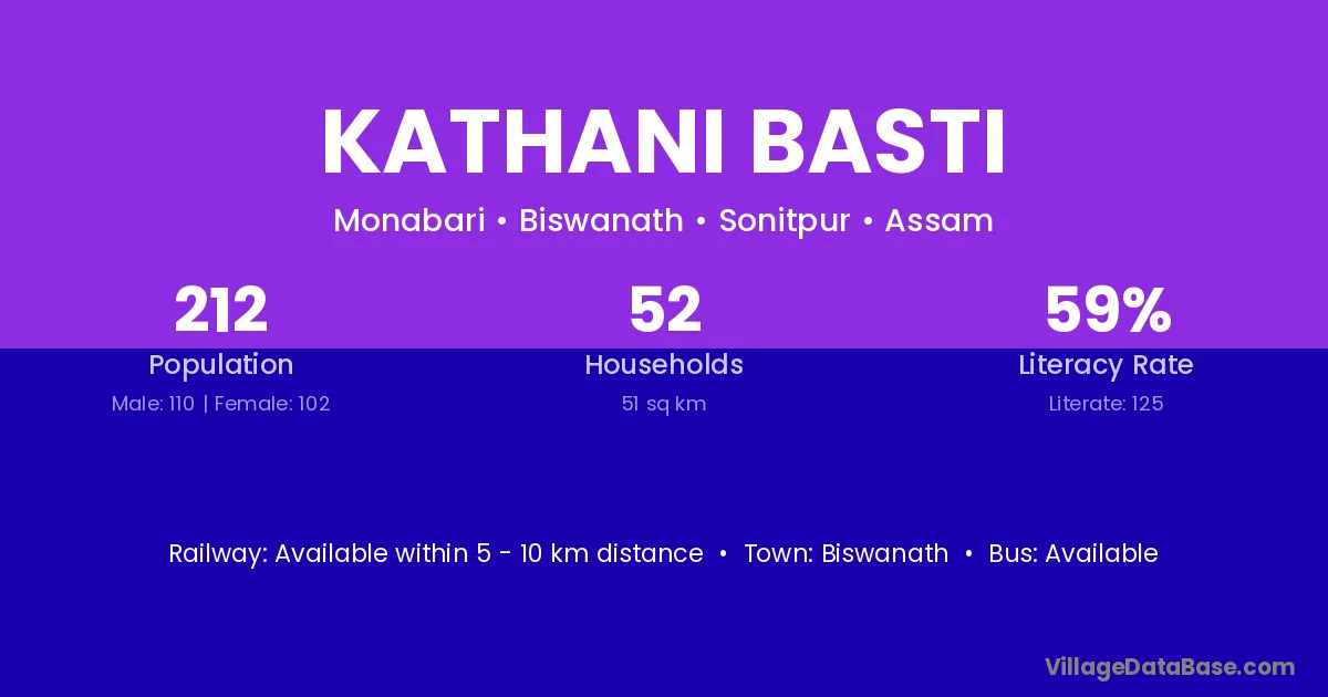 Kathani Basti village has a total population of 212 people, of which 110 are males and 102 are females.