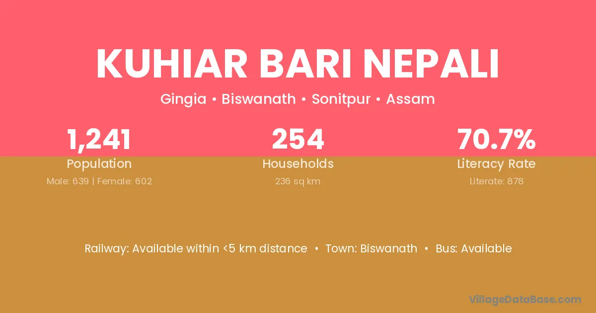 Kuhiar Bari Nepali village has a total population of 1,241 people, of which 639 are males and 602 are females.