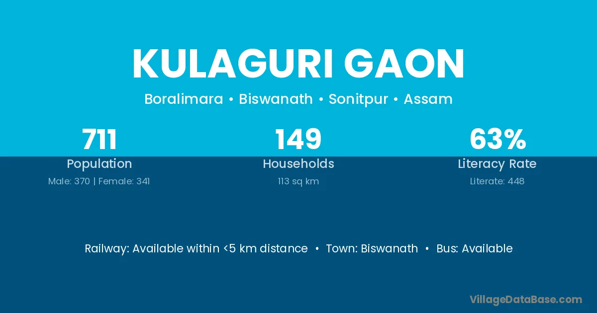 Kulaguri Gaon village has a total population of 711 people, of which 370 are males and 341 are females.