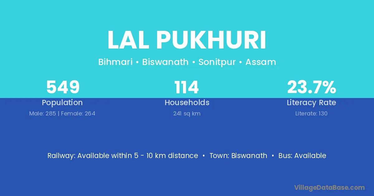 Lal Pukhuri village has a total population of 549 people, of which 285 are males and 264 are females.