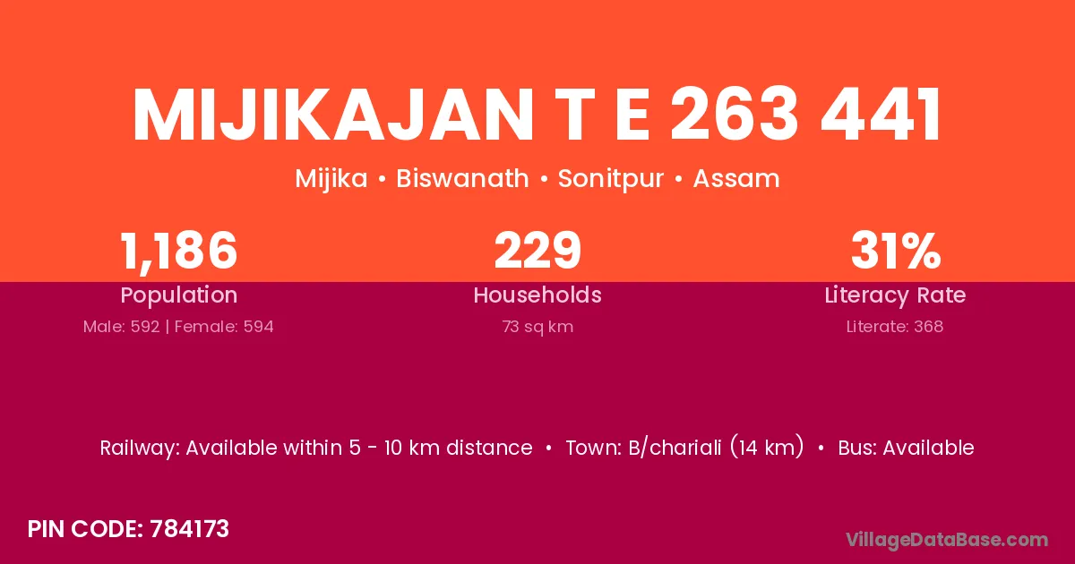 Mijikajan T E 263 441 village has a total population of 1,186 people, of which 592 are males and 594 are females.