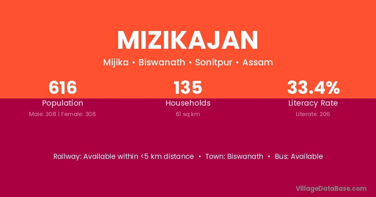 Mizikajan village has a total population of 616 people, of which 308 are males and 308 are females.
