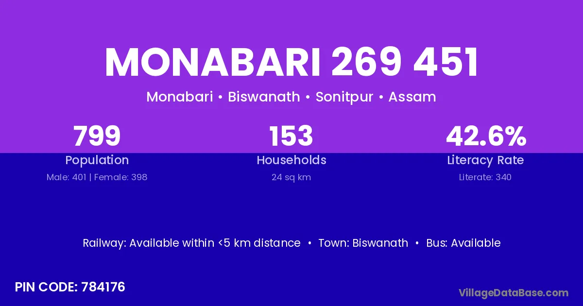 Biswanath is the nearest town to Monabari 269 451 village for major economic activities