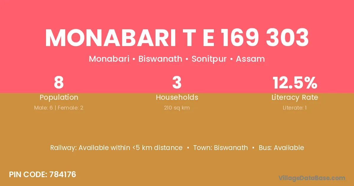Monabari T E 169 303 village has a total population of 8 people, of which 6 are males and 2 are females.