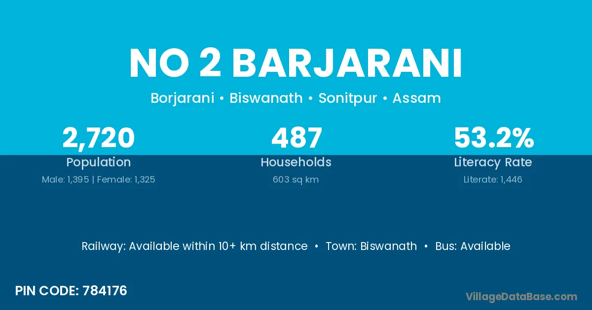 Biswanath is the nearest town to No 2 Barjarani village for major economic activities