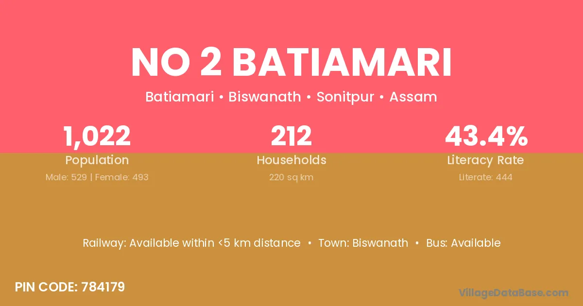 No 2 Batiamari village has a total population of 1,022 people, of which 529 are males and 493 are females.