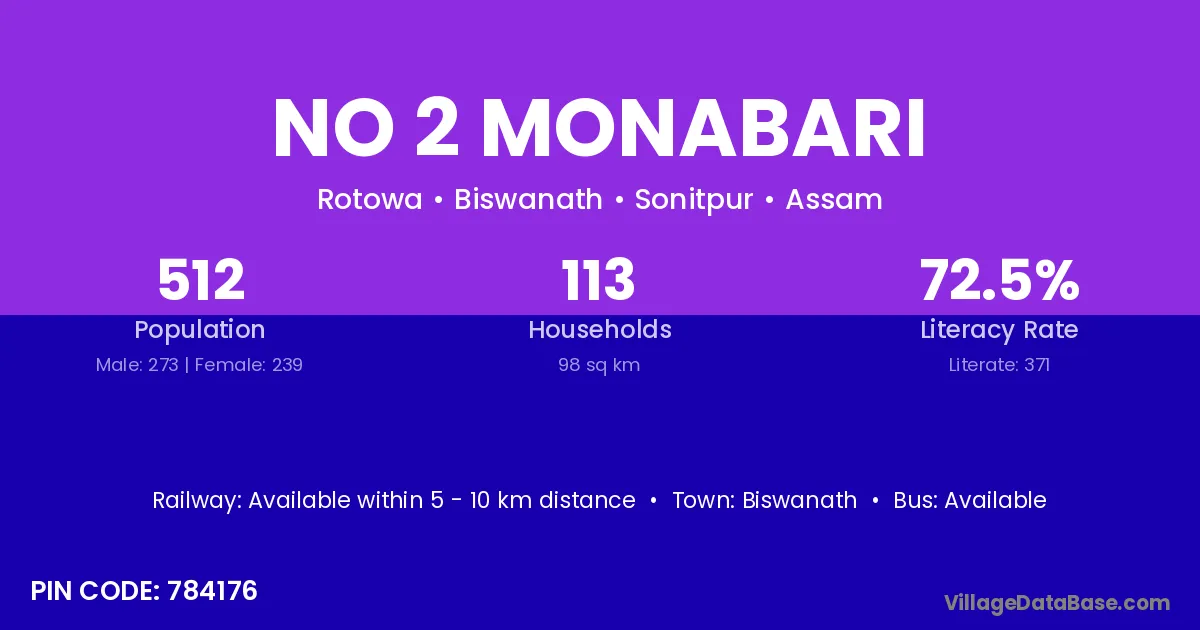 No 2 Monabari village has a total population of 512 people, of which 273 are males and 239 are females.