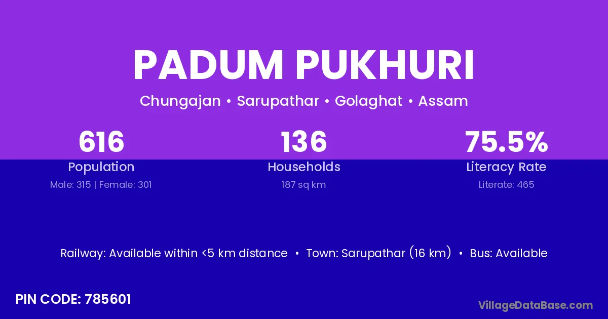 Padum Pukhuri village has a total population of 662 people, of which 351 are males and 311 are females.