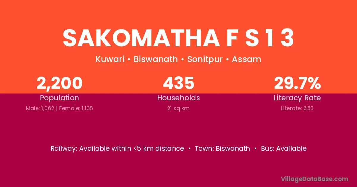 Sakomatha F S 1 3 village has a total population of 2,200 people, of which 1,062 are males and 1,138 are females.