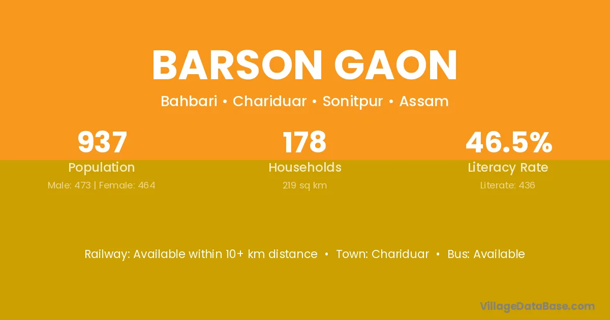 Barson Gaon village has a total population of 937 people, of which 473 are males and 464 are females.