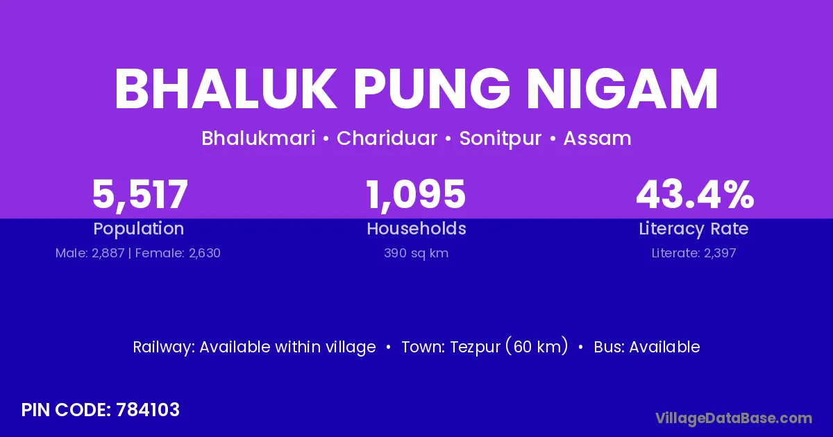 Tezpur (60 km) is the nearest town to Bhaluk Pung Nigam village for major economic activities and is located approximately 60 km away.