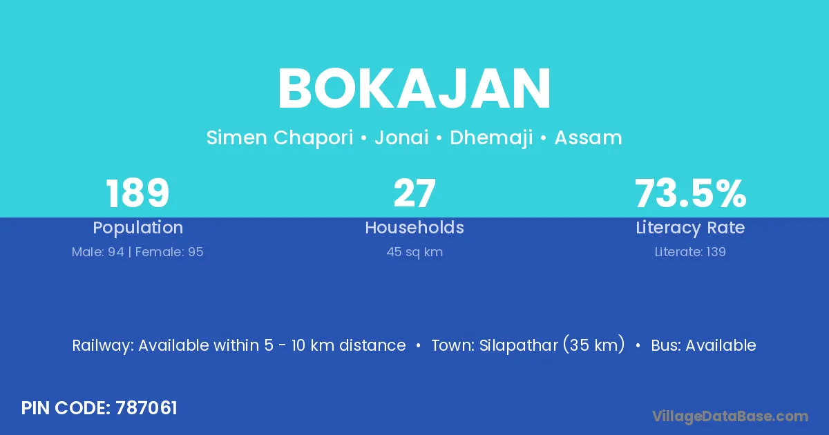 The literacy rate of Bokajan village is 72.38%. Male literacy stands at 78.91% and female literacy at 63.85%.