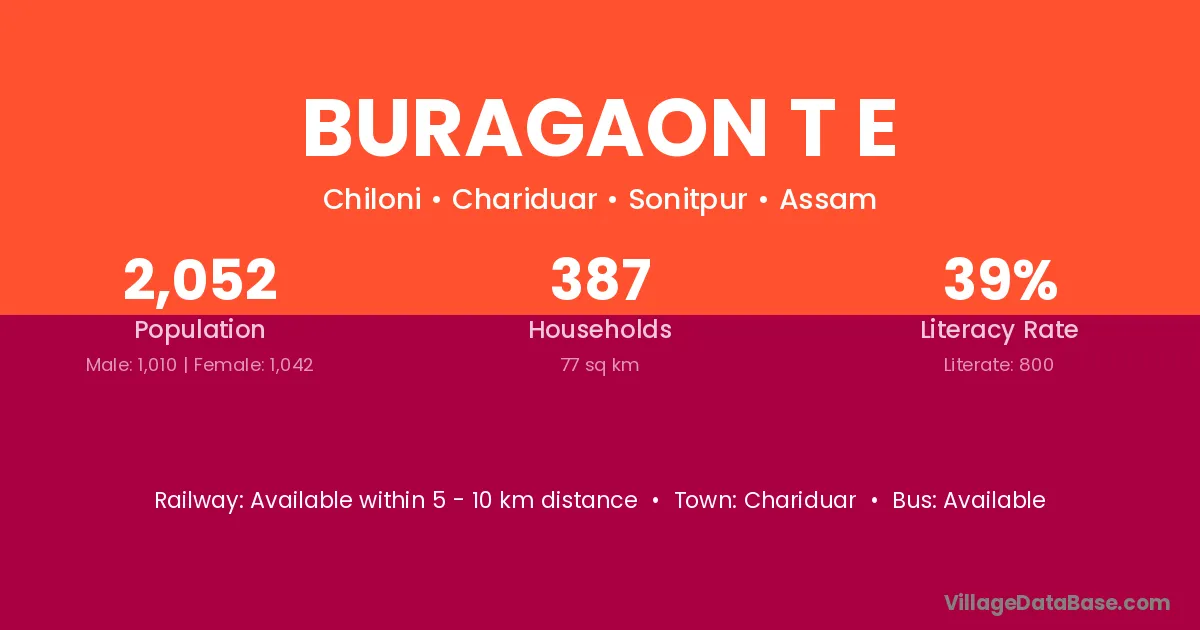 Buragaon T E village has a total population of 2,052 people, of which 1,010 are males and 1,042 are females.