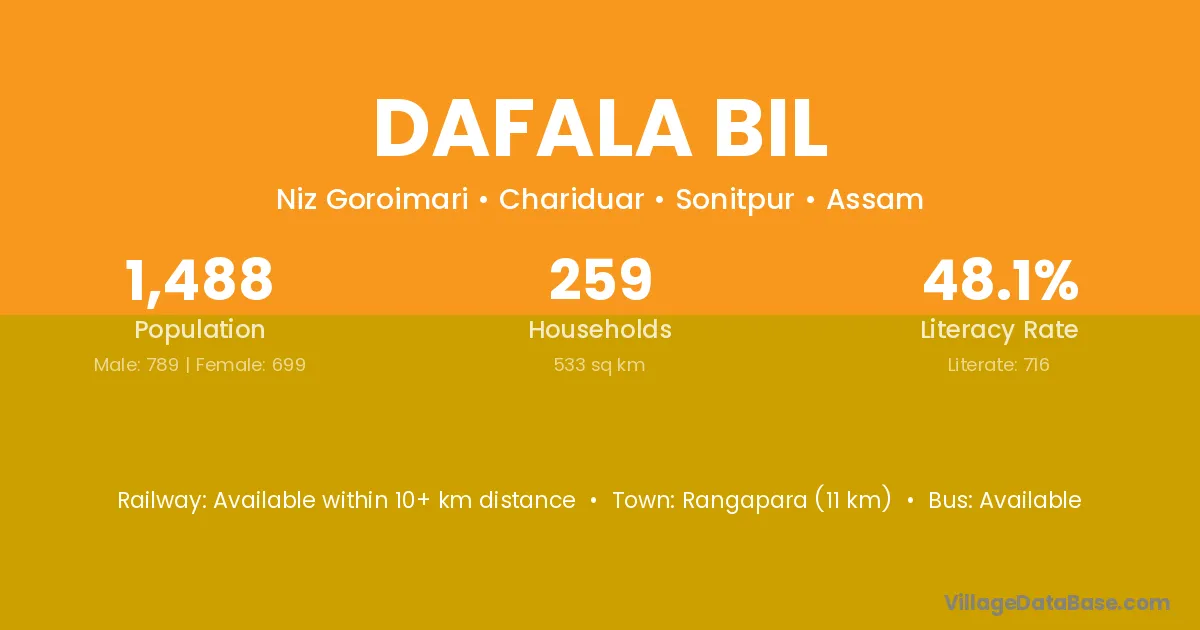 Rangapara (11 km) is the nearest town to Dafala Bil village for major economic activities and is located approximately 11 km away.