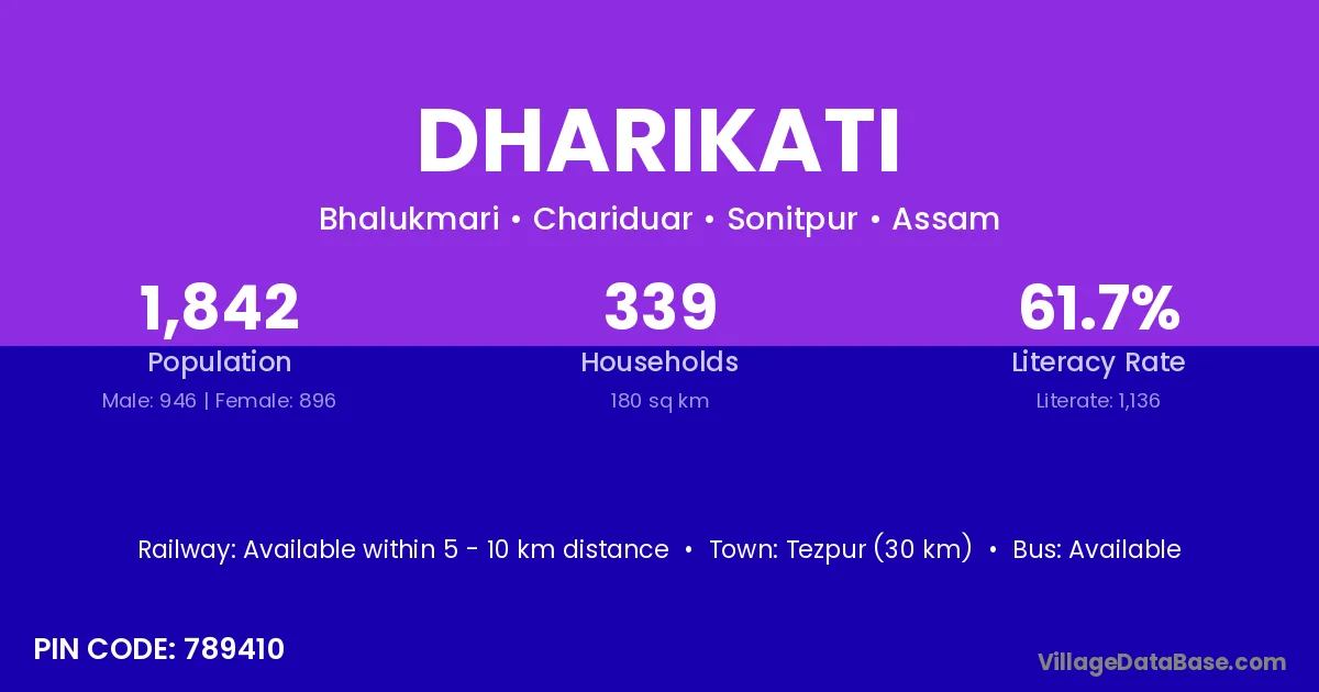 Tezpur (30 km) is the nearest town to Dharikati village for major economic activities and is located approximately 30 km away.