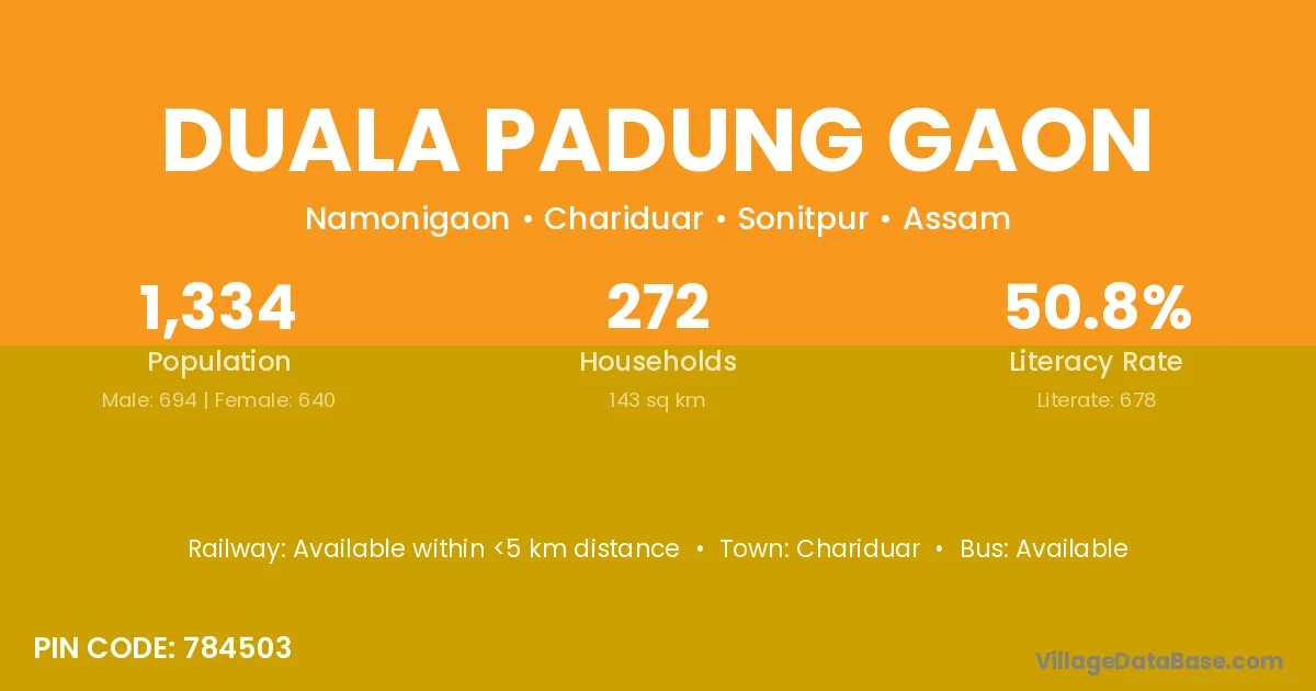 Duala Padung Gaon village has a total population of 1,334 people, of which 694 are males and 640 are females.