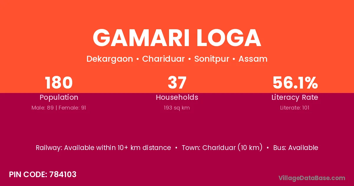 Chariduar (10 km) is the nearest town to Gamari Loga village for major economic activities and is located approximately 10 km away.