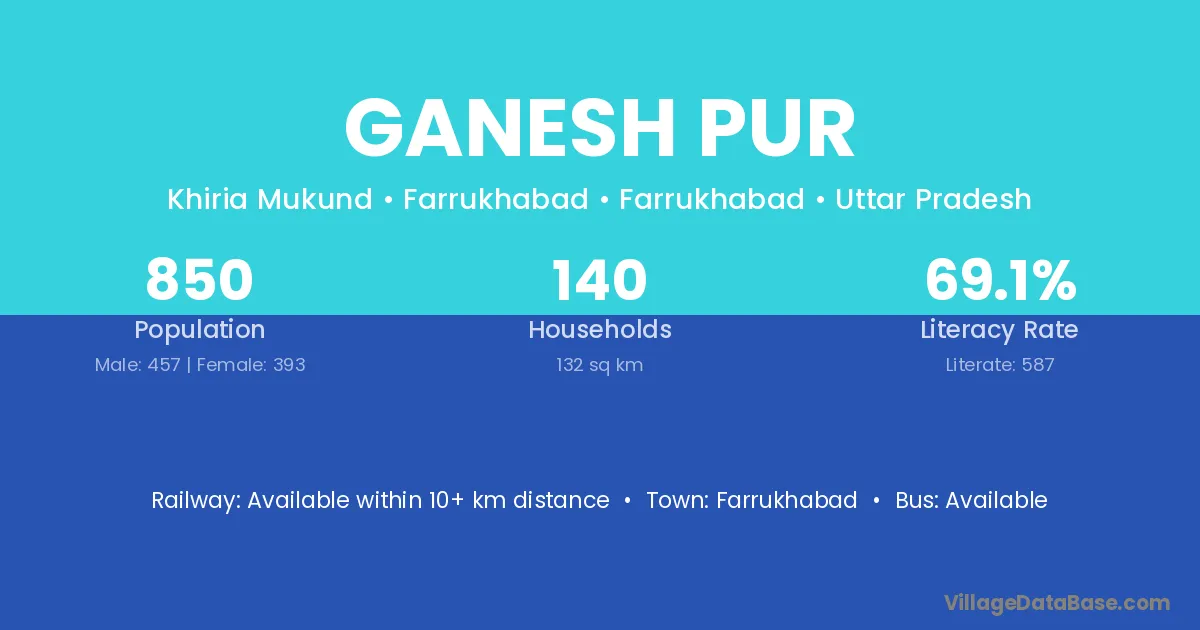 The literacy rate of Ganesh Pur village is 65.05%. Male literacy stands at 67.29% and female literacy at 62.63%.