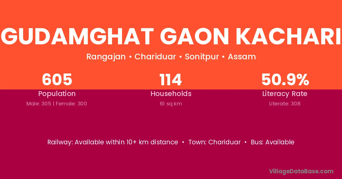 Gudamghat Gaon Kachari village has a total population of 605 people, of which 305 are males and 300 are females.