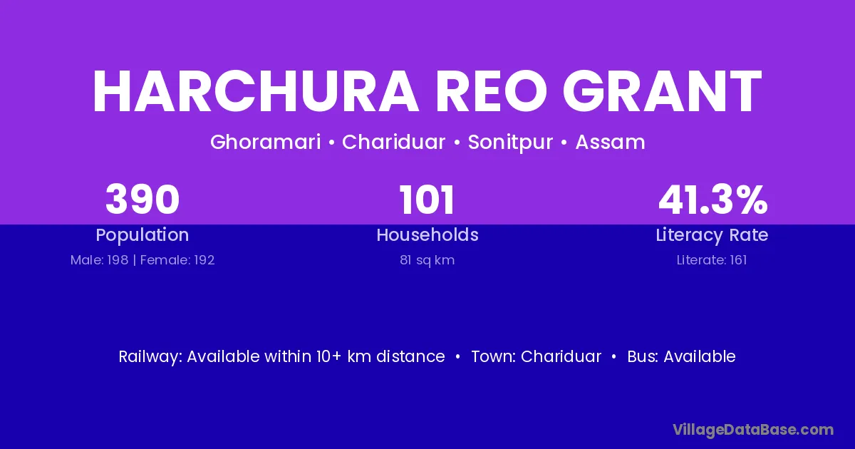 Harchura Reo Grant village has a total population of 390 people, of which 198 are males and 192 are females.