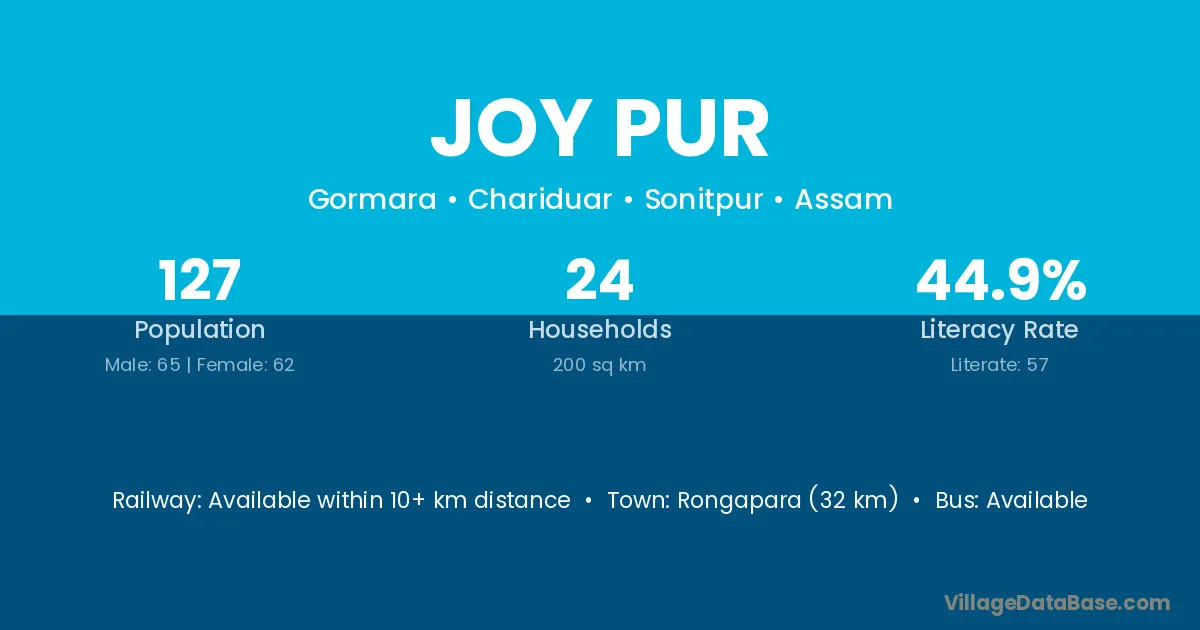 Rongapara (32 km) is the nearest town to Joy Pur village for major economic activities and is located approximately 32 km away.