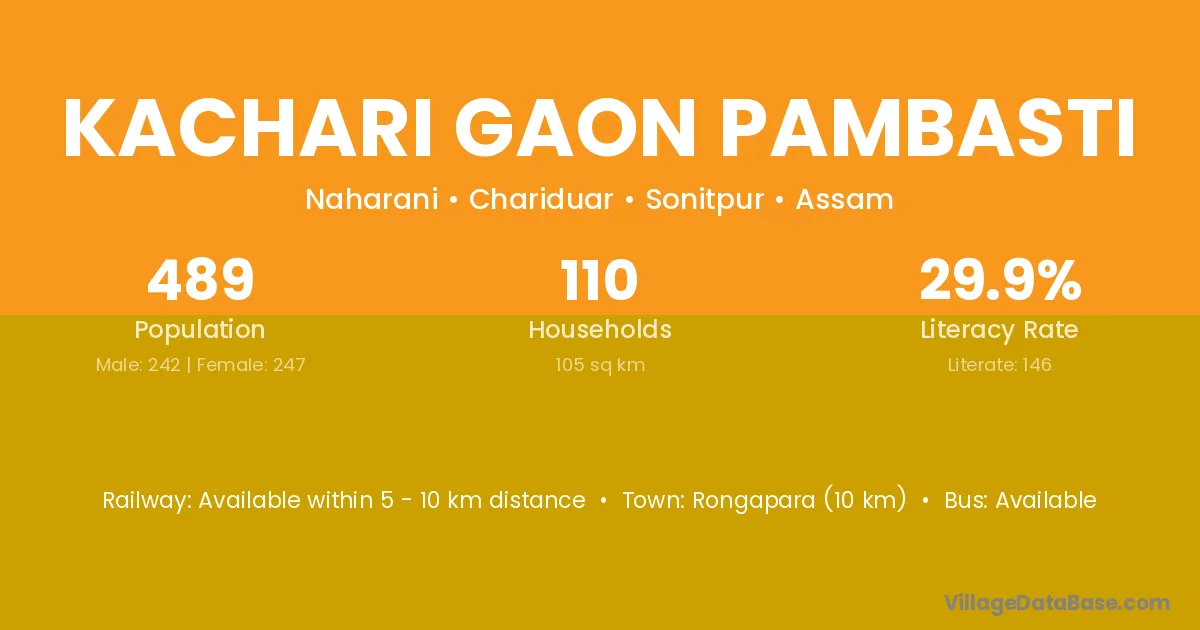 Kachari Gaon Pambasti village has a total population of 489 people, of which 242 are males and 247 are females.