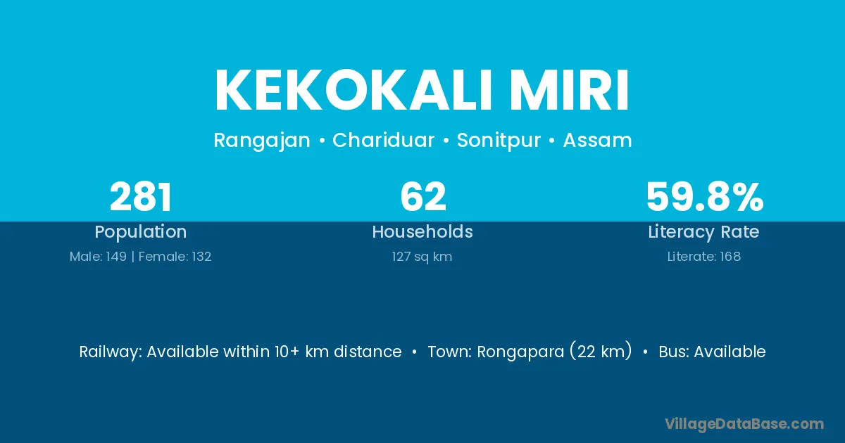 Rongapara (22 km) is the nearest town to Kekokali Miri village for major economic activities and is located approximately 22 km away.