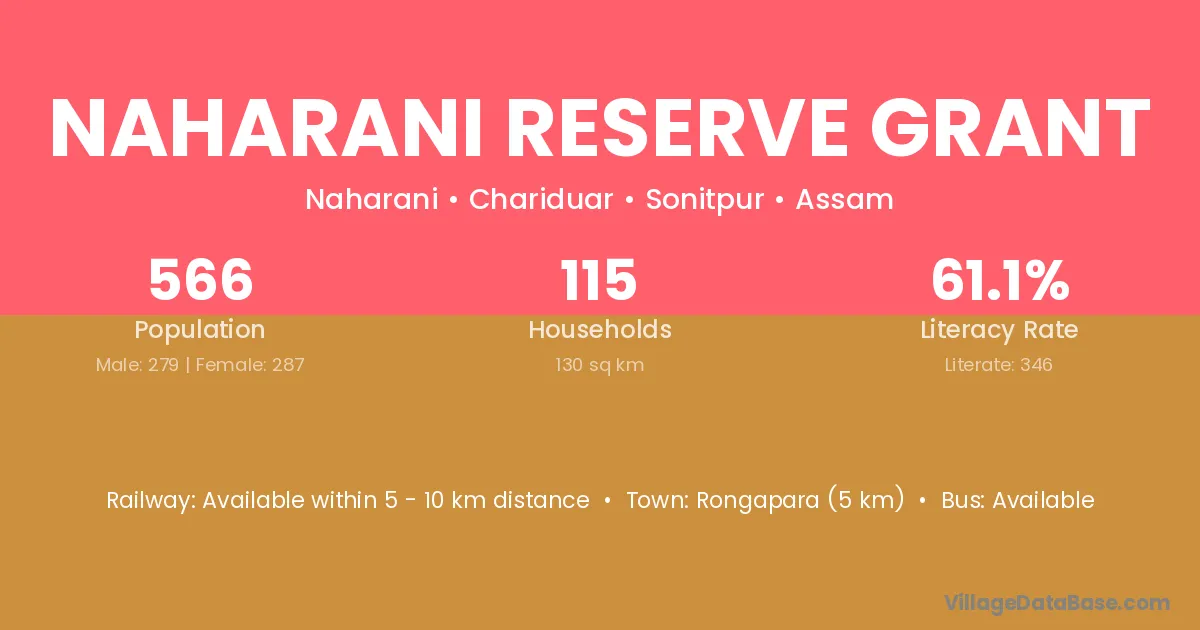 Naharani Reserve Grant village has a total population of 566 people, of which 279 are males and 287 are females.