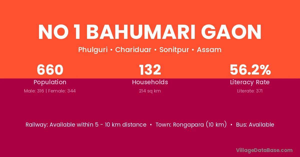 No 1 Bahumari Gaon village has a total population of 660 people, of which 316 are males and 344 are females.