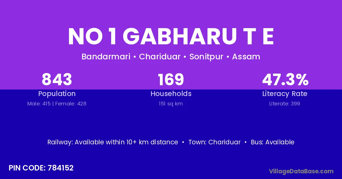 No 1 Gabharu T E village has a total population of 843 people, of which 415 are males and 428 are females.