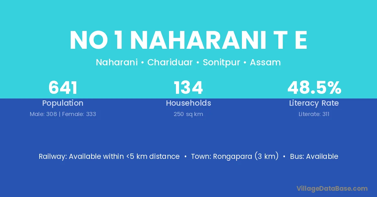 No 1 Naharani T E village has a total population of 641 people, of which 308 are males and 333 are females.