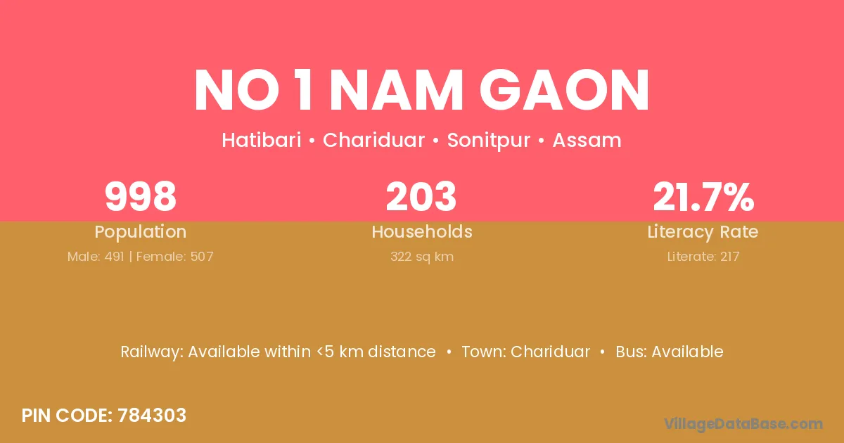 No 1 Nam Gaon village has a total population of 998 people, of which 491 are males and 507 are females.