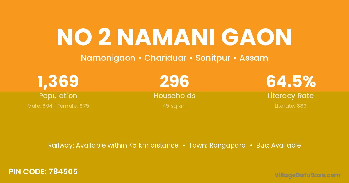 No 2 Namani Gaon village has a total population of 1,369 people, of which 694 are males and 675 are females.