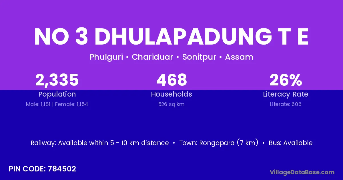 No 3 Dhulapadung T E village has a total population of 2,335 people, of which 1,181 are males and 1,154 are females.