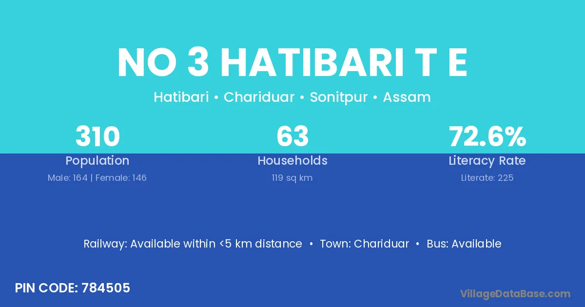 No 3 Hatibari T E village has a total population of 310 people, of which 164 are males and 146 are females.